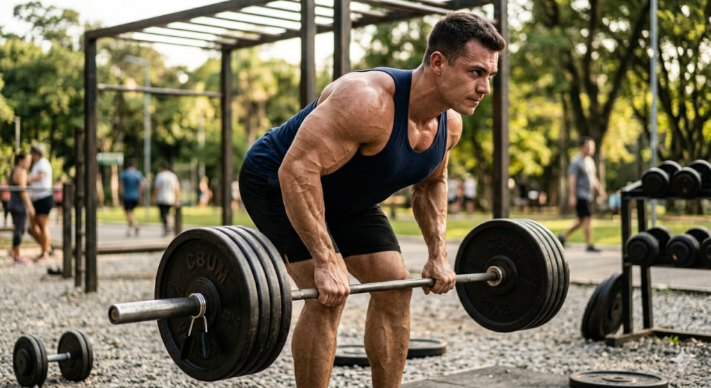 A remada curvada exige que você mantenha o tronco inclinado durante todo o movimento — o que ativa a lombar e o core isometricamente enquanto as costas e os braços trabalham dinamicamente. É um exercício altamente eficiente em termos de calorias gastas por minuto.